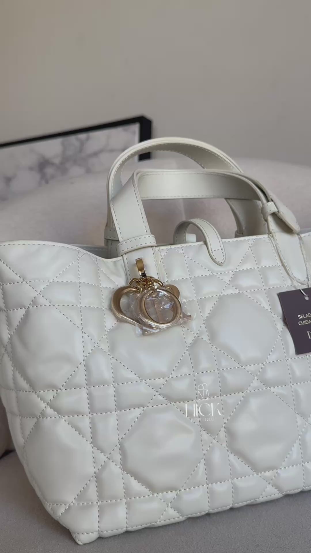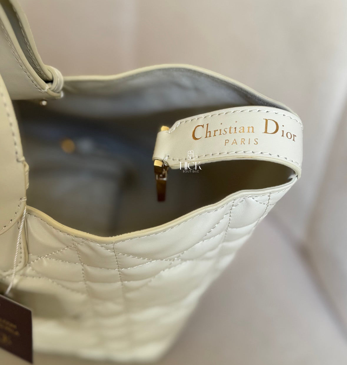 A bolsa Dior Toujours média é feita de couro de bezerro com o padrão Macrocannage e possui um fecho de couro que permite ajustar a silhueta. Os pingentes D.I.O.R. de metal dourado claro e o pingente CD adicionam um toque elegante. A bolsa também inclui alças de mão ajustáveis.