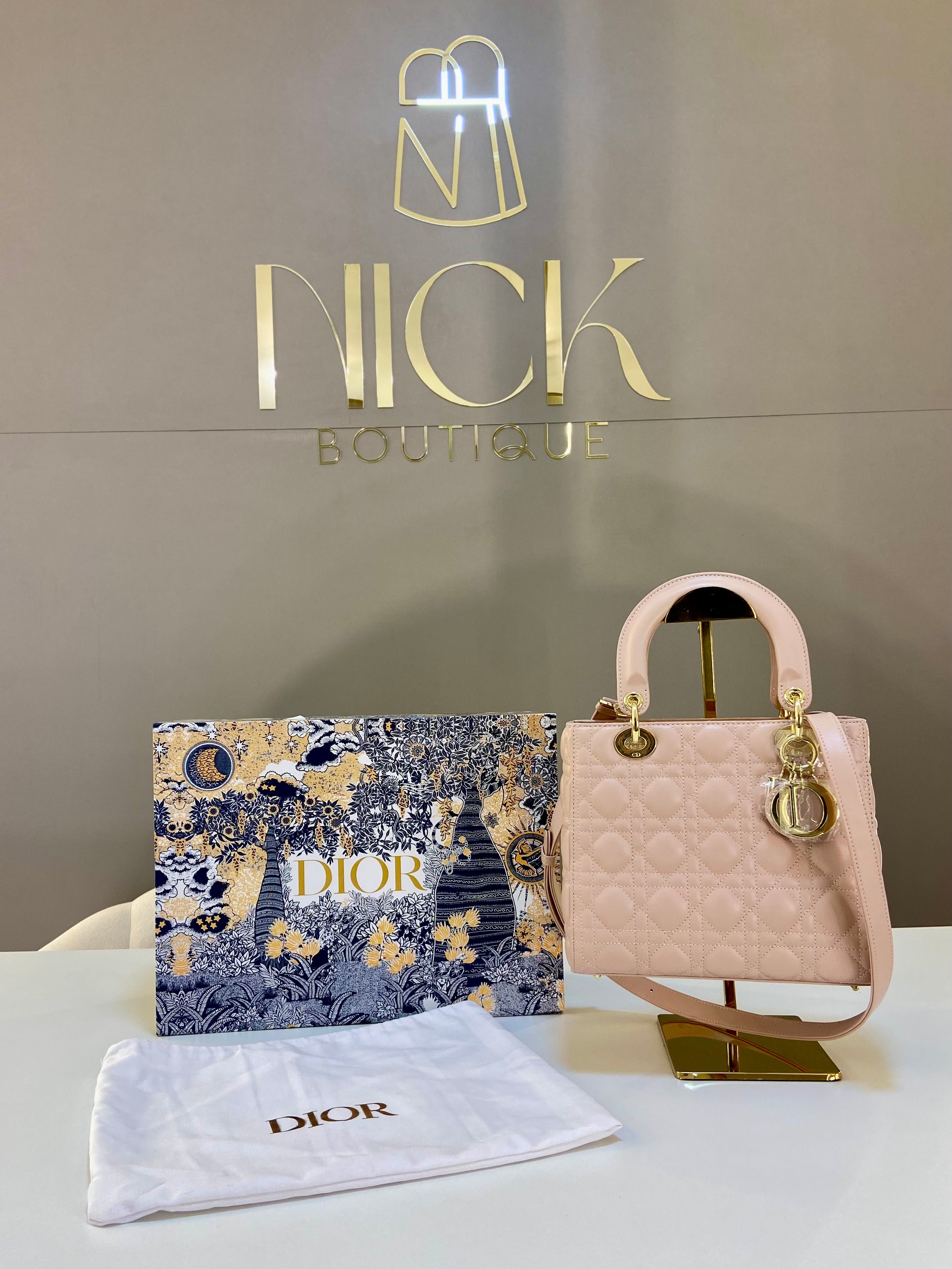 A bolsa Lady Dior personifica a visão de elegância e beleza da marca. É confeccionado em pele de cordeiro e apresenta costura Cannage para criar a famosa textura acolchoada que é sofisticada e atemporal. As joias Dior em metal com acabamento em ouro claro acrescentam um toque elegante. Esta bolsa Lady Dior tem uma alça de ombro fina removível de couro que pode ser carregada na mão ou na trsansversal.