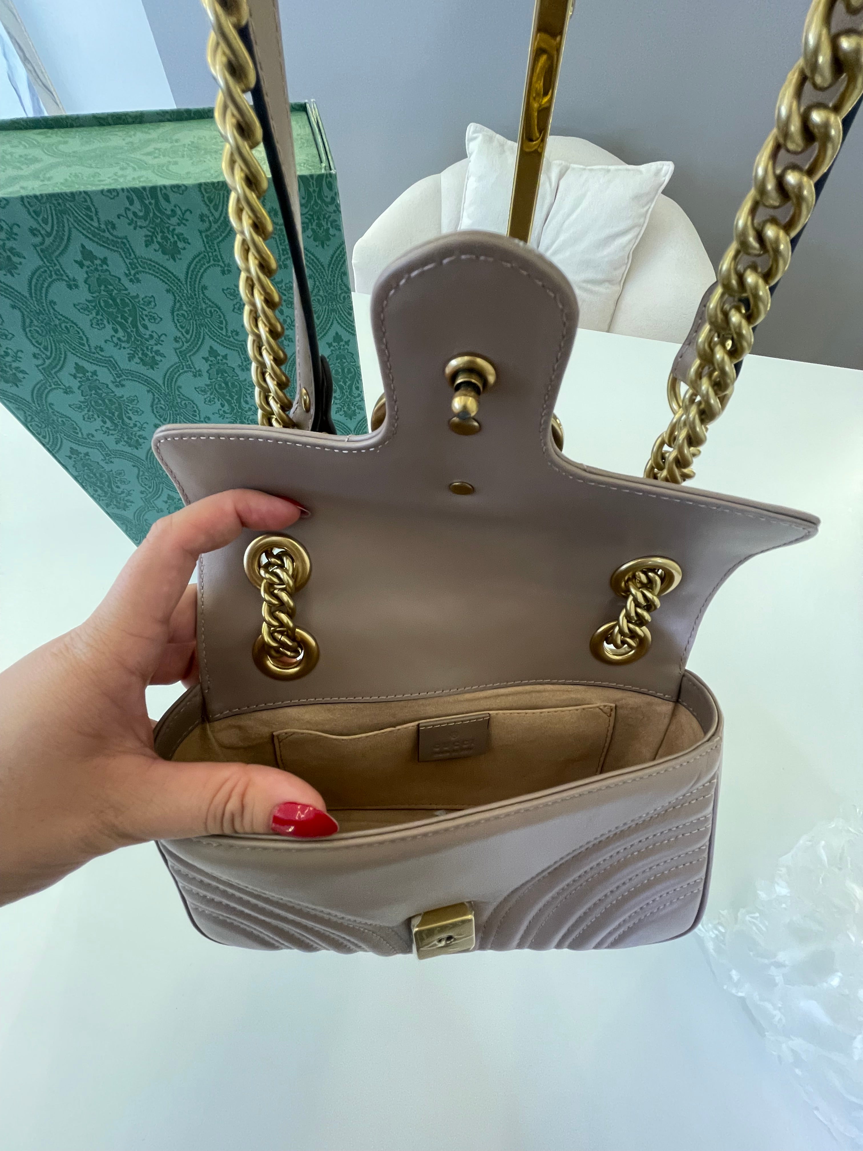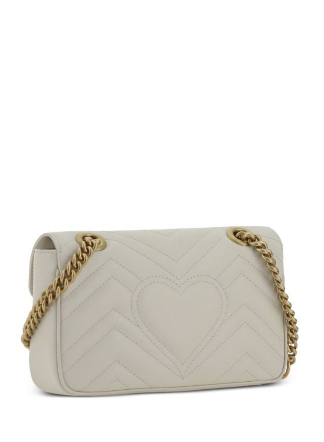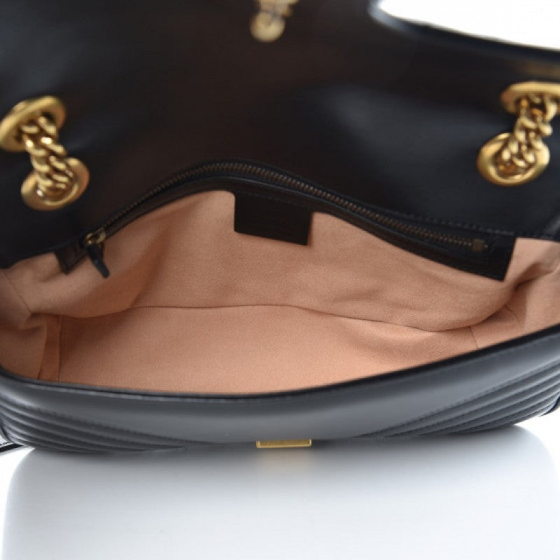 A bolsa GG Marmont 22cm apresenta um design levemente estruturado e um fechamento com aba oversized, adornada com a ferragem Duplo G em um tom de dourado envelhecido. Feita em couro chevron preto, conta com um detalhe em formato de coração na parte de trás, além de um bolso interno. Possui uma alça de ombro ajustável de 55 cm, que também pode ser utilizada como alça de mão com 30 cm, e seu fechamento é feito por encaixe.