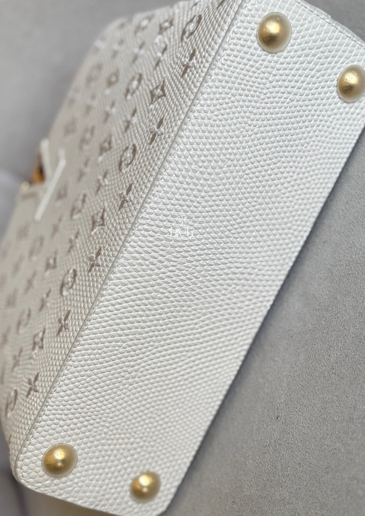 Bolsa em couro Taurillon, com alça de mão e alça removível ajustável para uso no ombro ou transversal. Interior em couro com compartimentos e bolso com zíper, ferragens douradas e tachas metálicas na base.