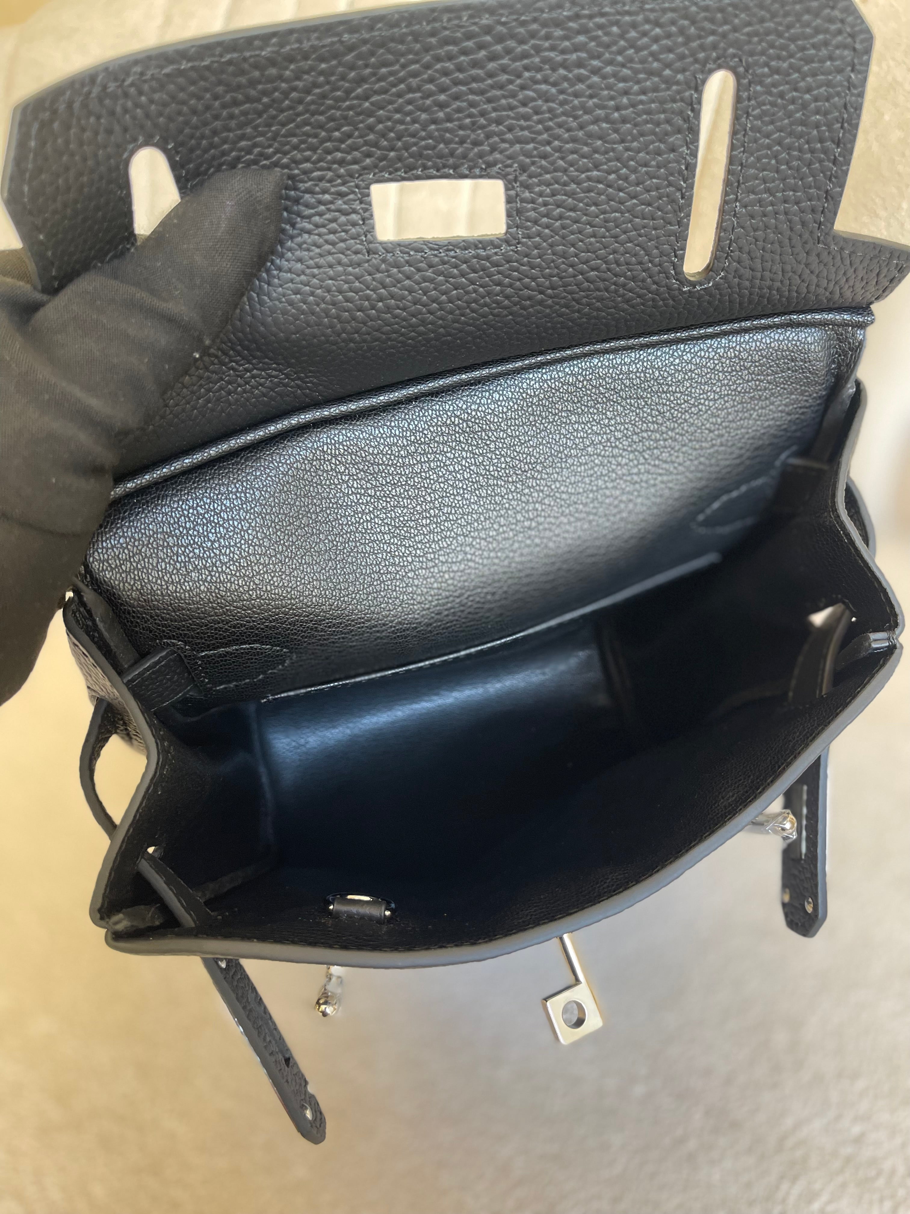 Mochila em couro Togo preto (Noir 89), com textura granulada e ferragens em paládio. Inspirada na linha Haut à Courroies, traz fecho de alternância, interior em pele de cordeiro com bolso interno e alça larga ajustável para uso versátil. Acompanha acessórios como dustbag, cadeado, chaves e caixa.