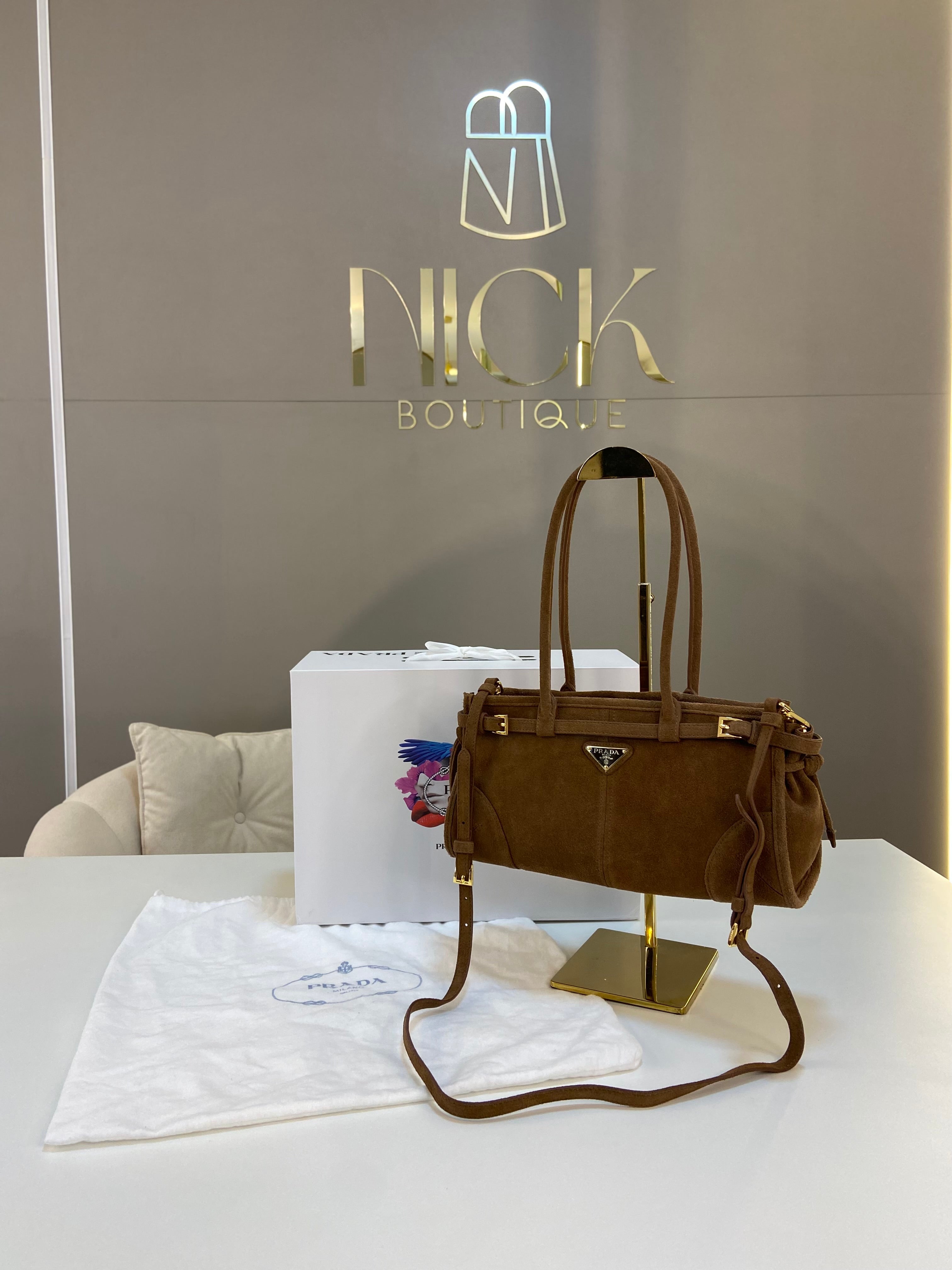 Bolsa em camurça com design contemporâneo e elegante. Possui alças de mão em couro, alças de ombro ajustáveis e decorativas, detalhes em metal dourado e logotipo triangular que acrescenta um toque icônico.