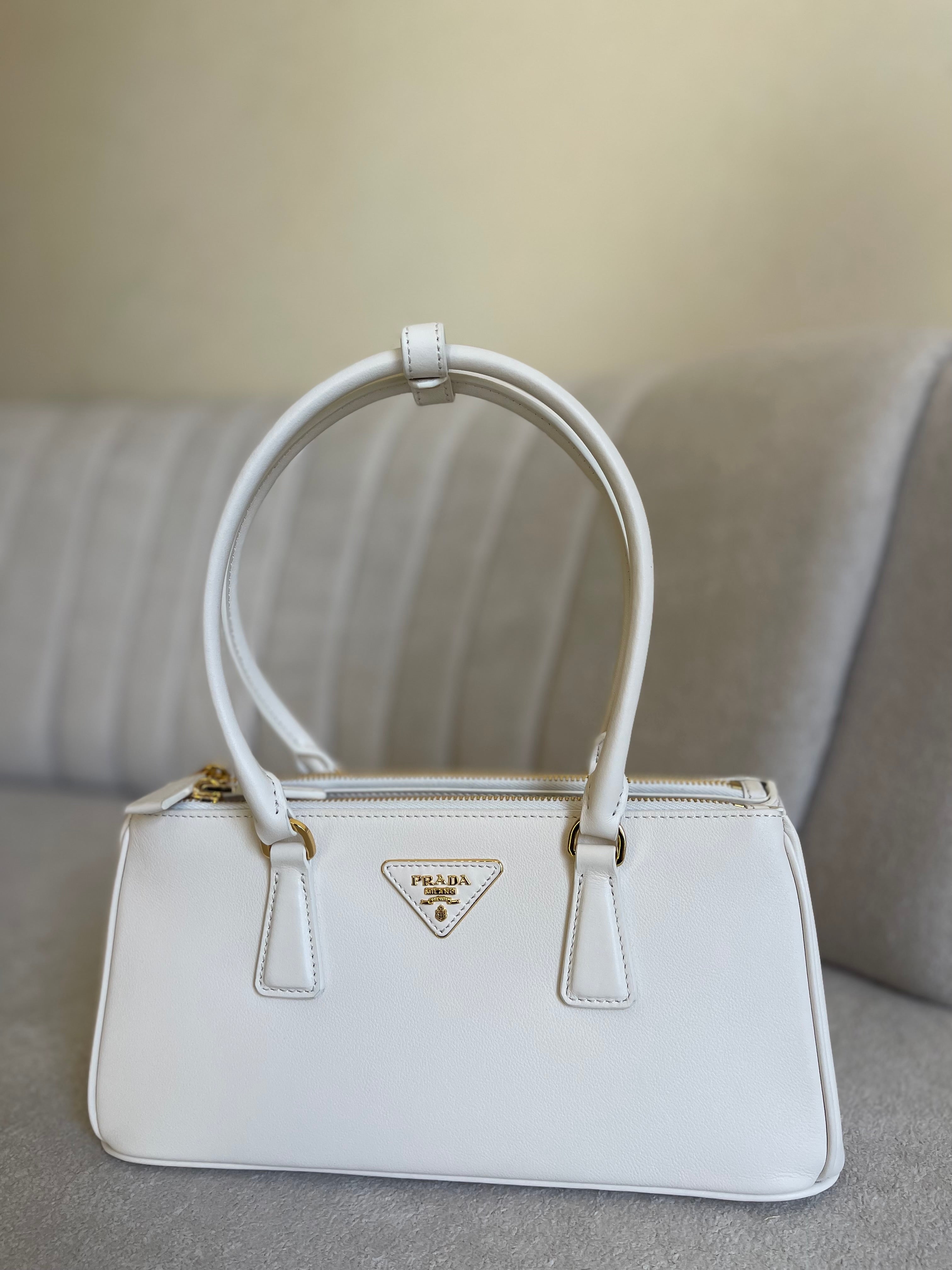 A bolsa é confeccionada no clássico couro Saffiano, resistente a riscos e água, com design estruturado em formato trapezoidal. Traz alças de mão reforçadas, ferragens douradas e o icônico logo triangular da Prada na frente. Pode incluir bolsos internos e externos com zíper e laterais ajustáveis por botões de pressão. Acompanha alça longa removível e ajustável, além de chaveiro em couro.