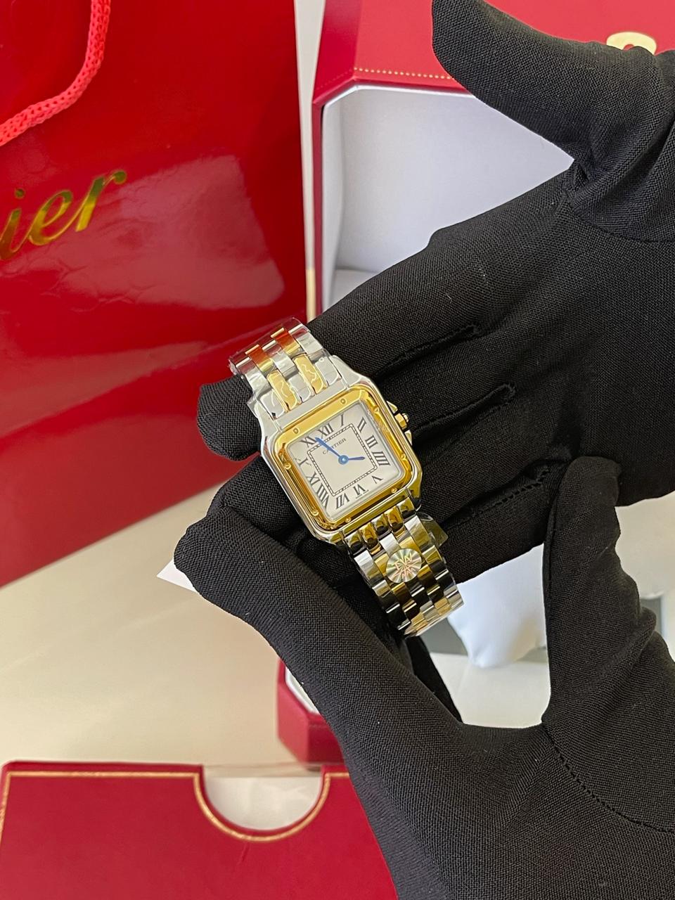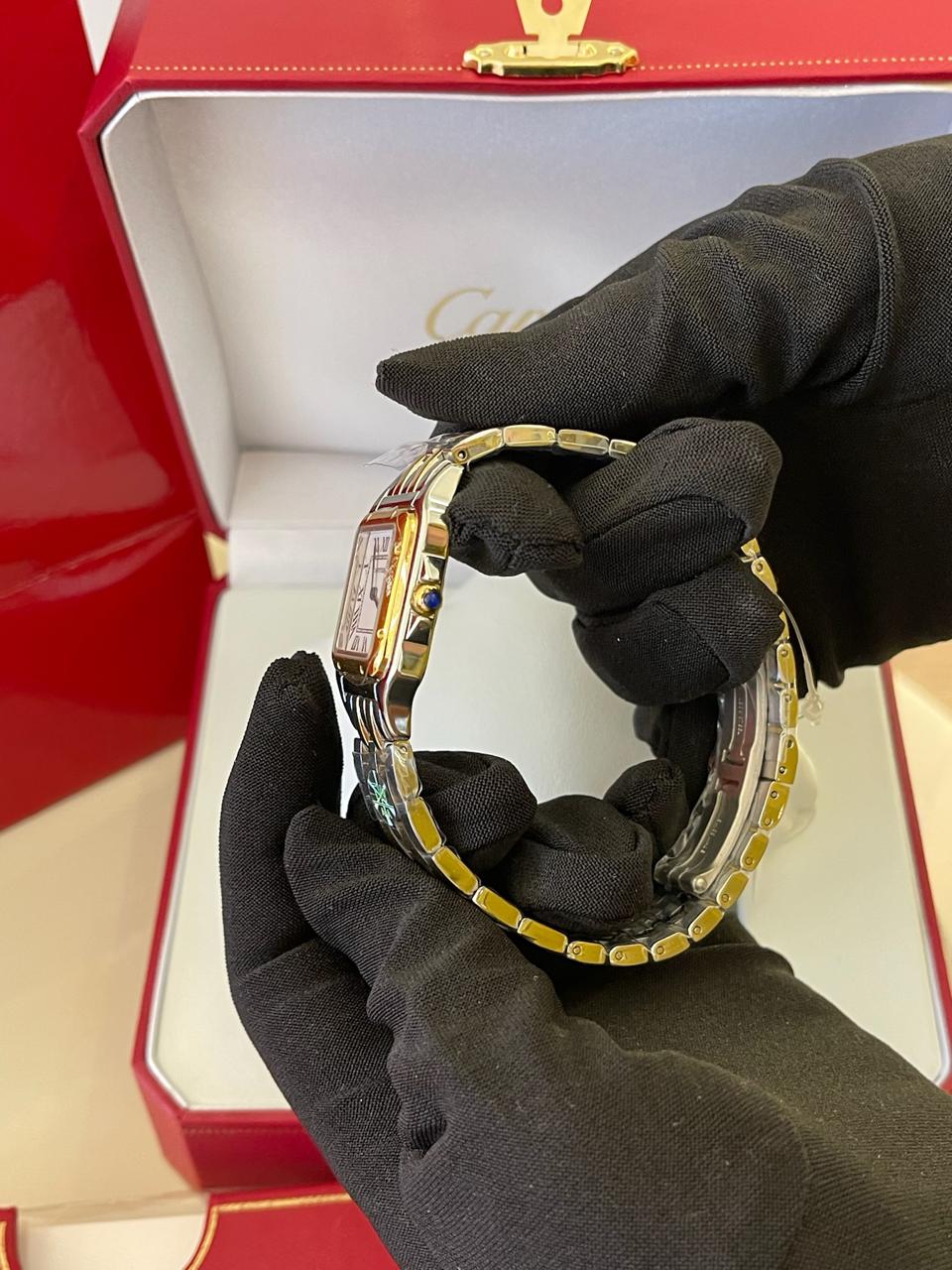 Relógio Panthère de Cartier, modelo pequeno com caixa em ouro amarelo e aço (22 mm x 30 mm), coroa com espinélio azul e pulseira combinada. Resistente a 3 bars (~30 metros).