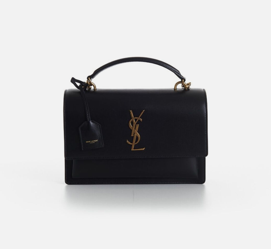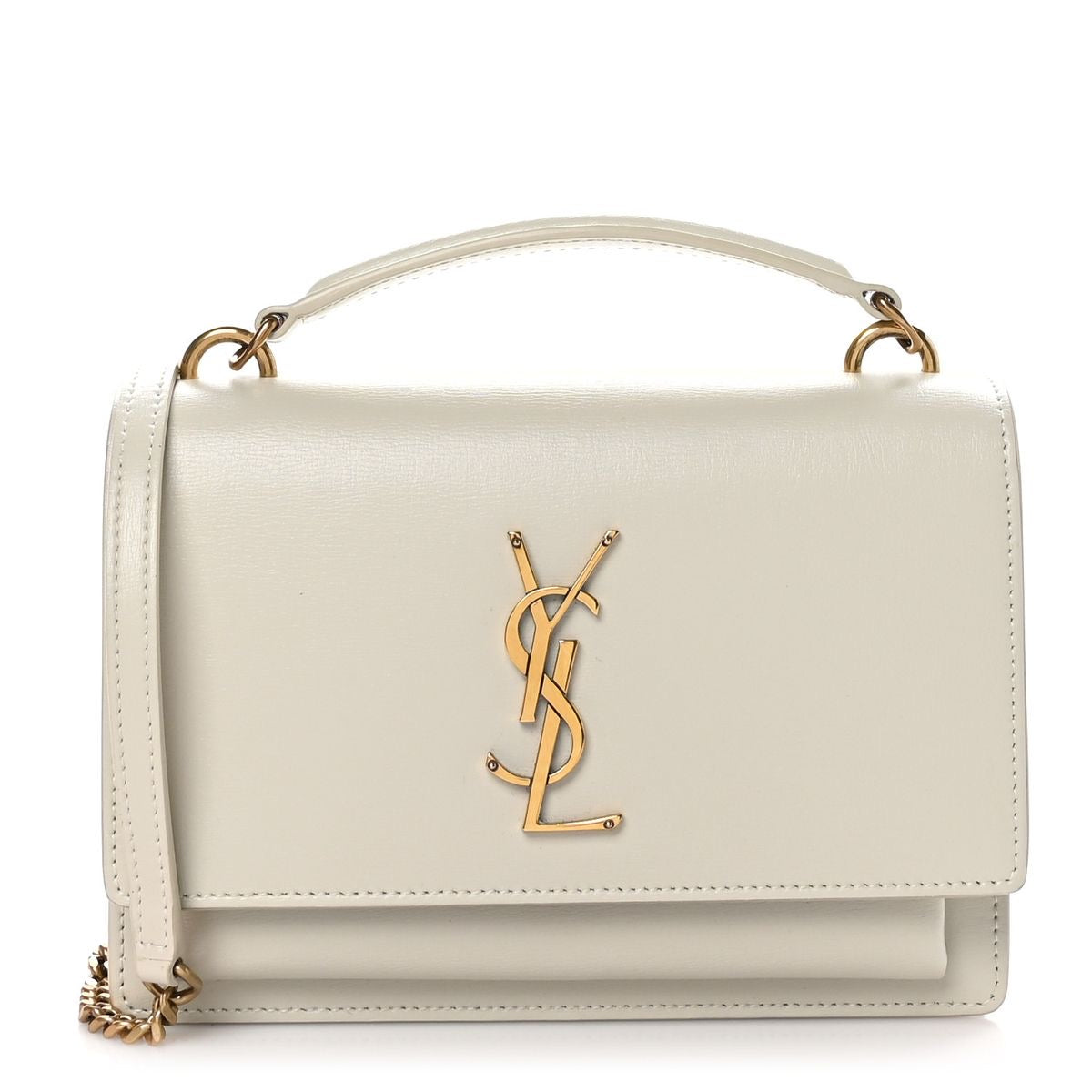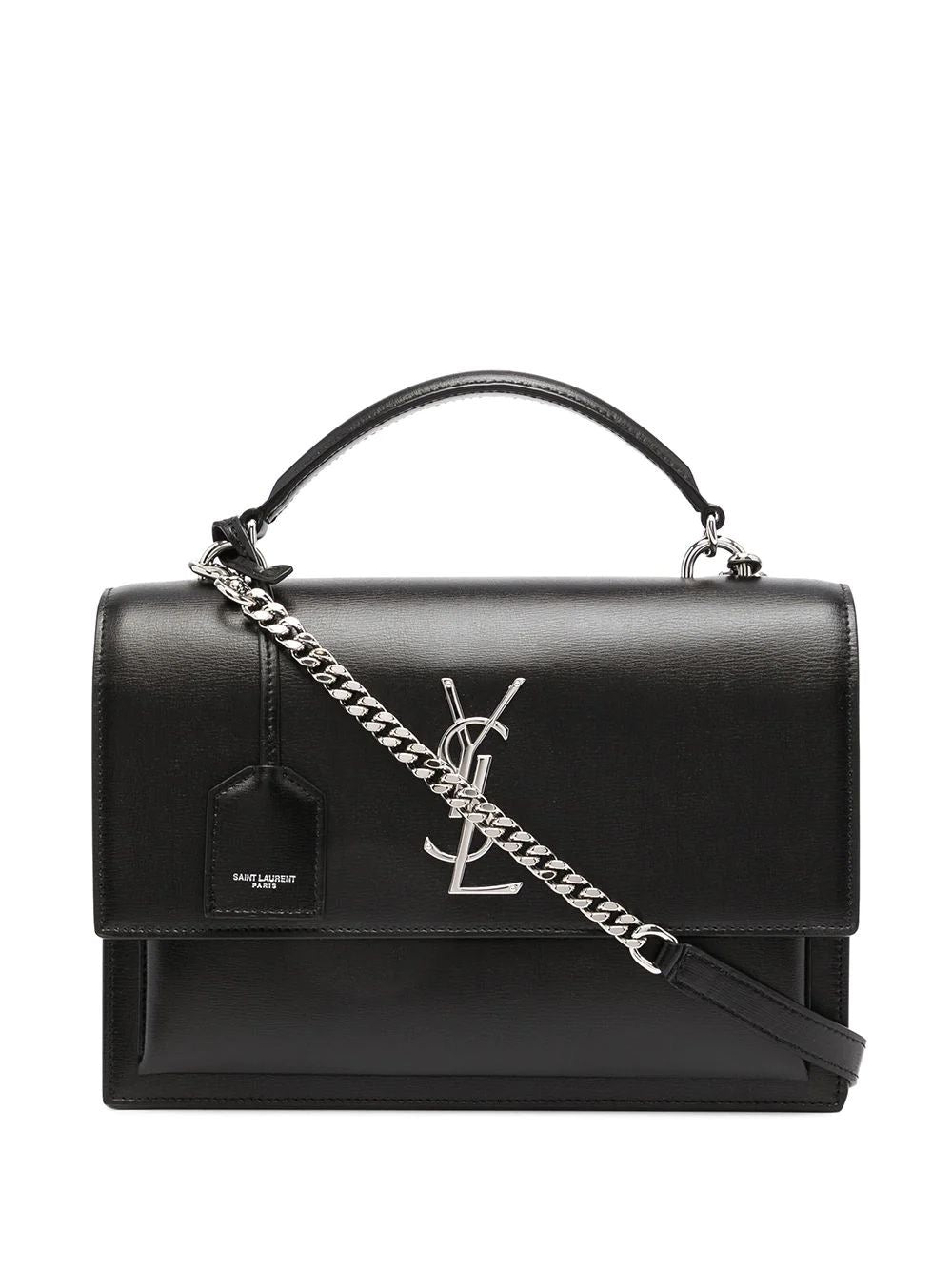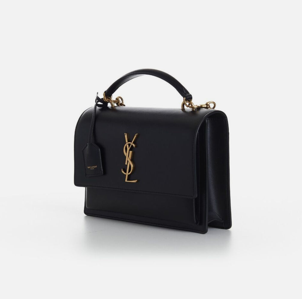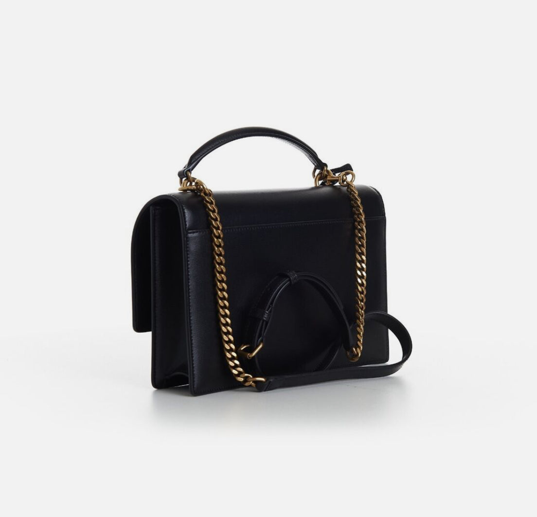 Uma bolsa sofisticada com aba forrada em couro, destacando o icônico Cassandre, e um chaveiro em couro sofisticado. Estruturada e funcional, a bolsa possui laterais sanfonadas, um compartimento duplo, um bolso frontal e um amplo bolso traseiro. A corrente oferece conforto, podendo ser usada no ombro ou transversalmente e como bolsa de mão.